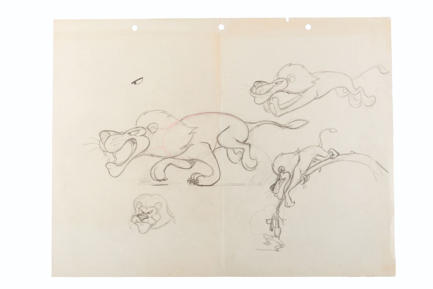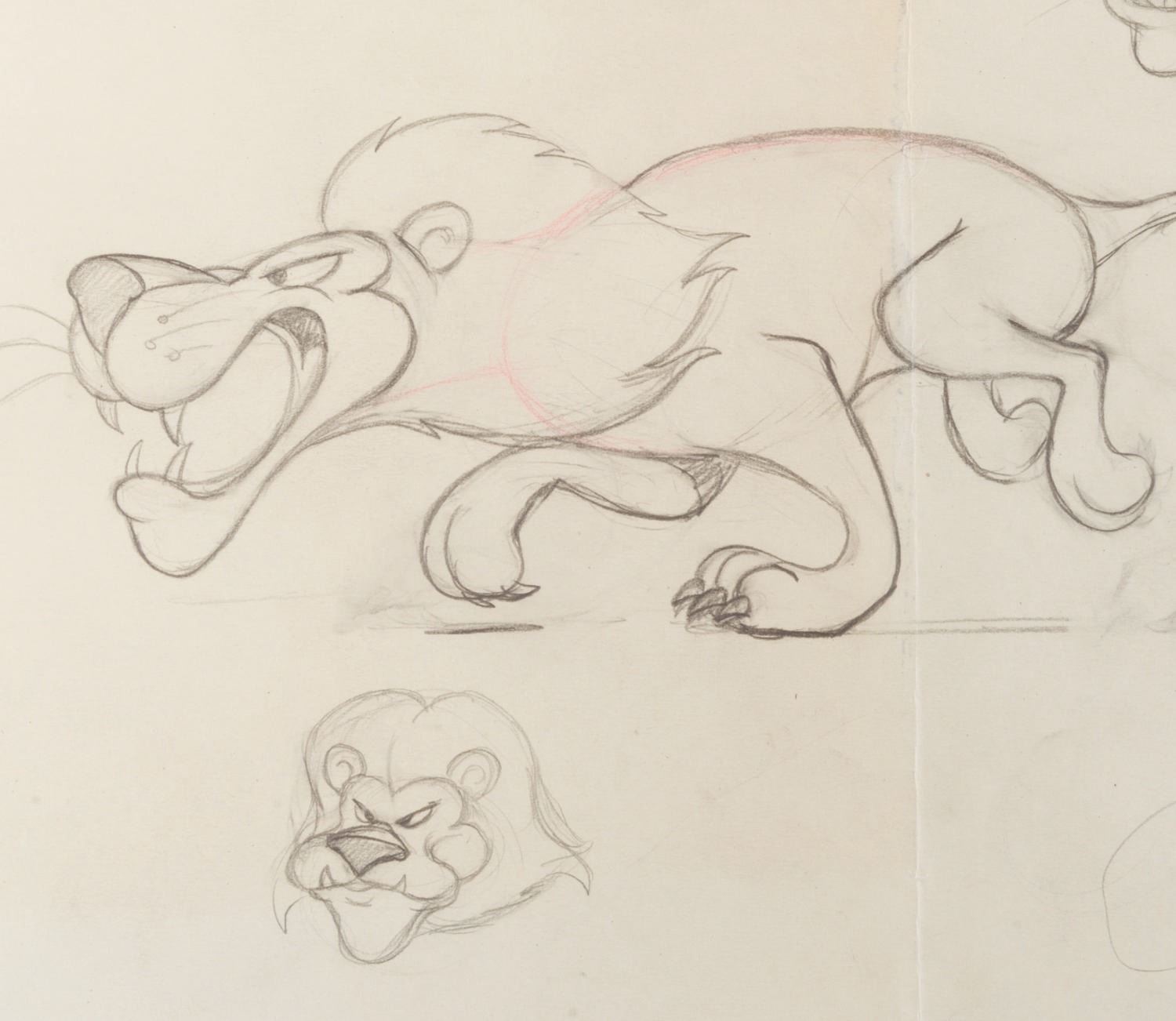 (Fleischer, 1940s) A hand-drawn model sheet of a lion attributed to Fleischer Studios. Measuring 11.75" x 15.5", the model sheet accomplished in graphite and red pencil is in good condition, with a vertical fold through center, and wear from age and production use including smudges.