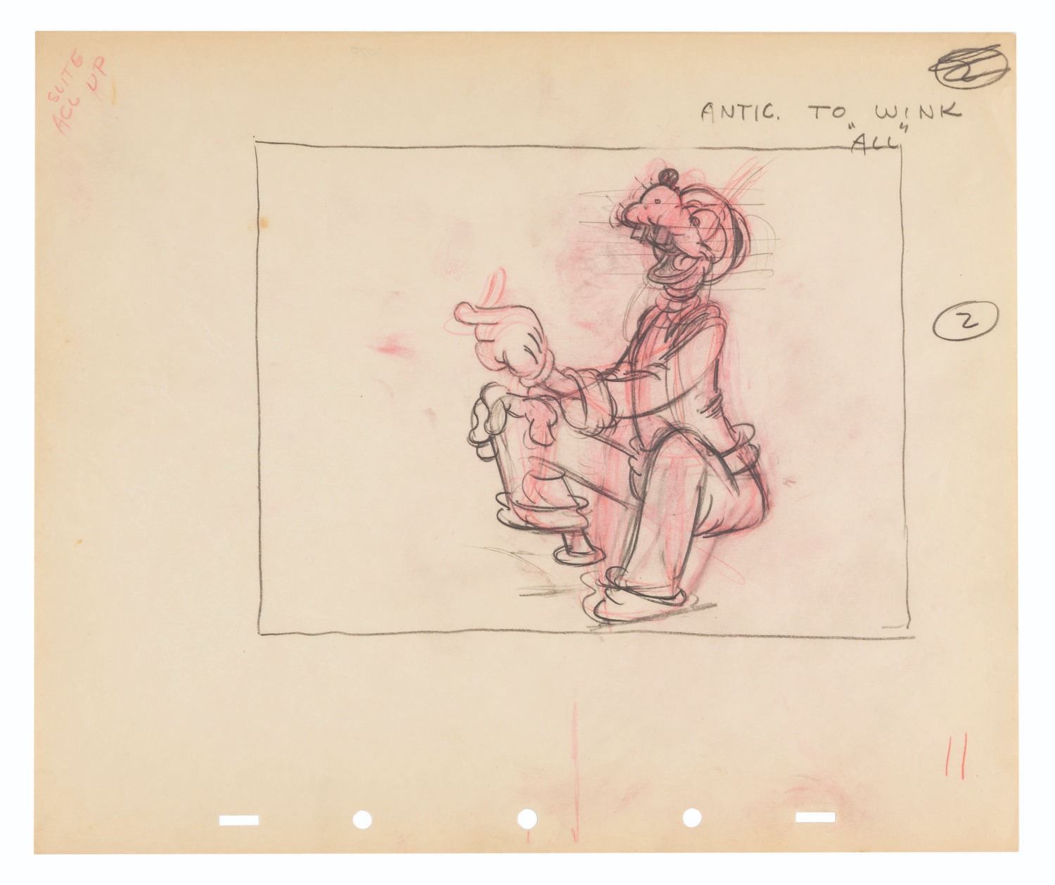 (Disney, 1939) An original layout drawing from "Goofy and Wilbur," Goofy’s first solo cartoon. Accomplished in red pencil and graphite, the drawing has a character image size of 5.5" x 4" on untrimmed 10" x 12" animation paper. The drawing is in good production-used condition with light edge wear, creasing, and light discoloration from age.
