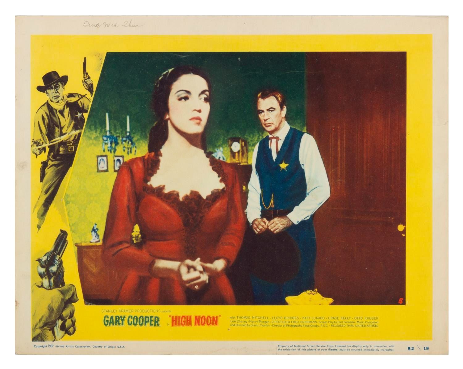 (United Artists, 1952) An original lobby card for "High Noon," starring Gary Cooper and Grace Kelly. Measuring 11" x 14", the lobby card is in good condition with wear from age and handling, and a pencil inscription on the top edge.