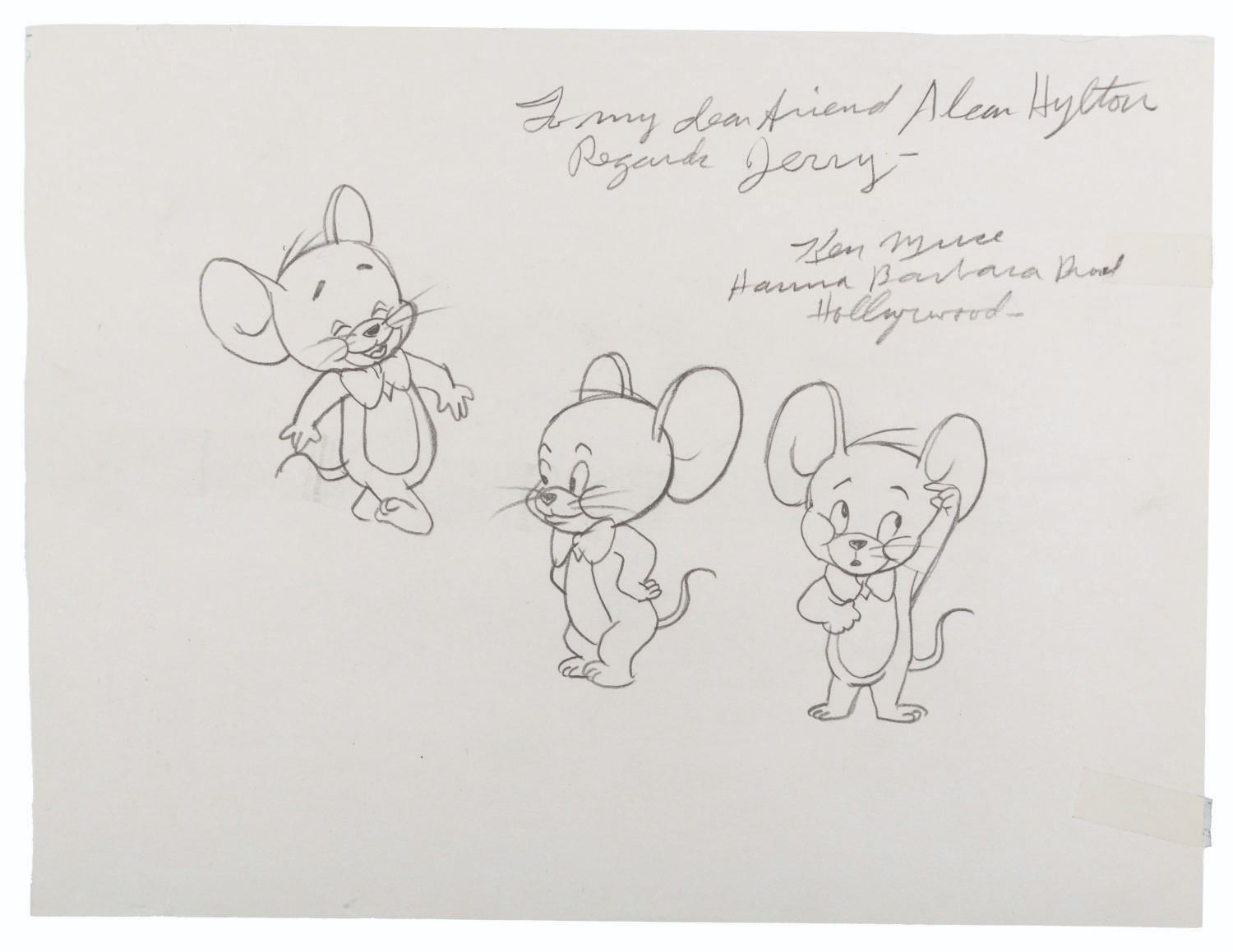 (Muse, 1970s-80s) A pencil drawing of Jerry from "Tom and Jerry" by animator Ken Muse, signed with a dedication to super collector Alan Hylton. Muse worked on the pilot for The Flintstones and many other Hanna-Barbera titles, as well as animating Jerry Mouse dancing with the live-action Gene Kelly in “Anchors Aweigh.” With a character image of 5” x 7.75” on 8.5” x 11.25” paper, the drawing is in very good condition, with two pieces of clear tape on the right edge that do not affect the image.