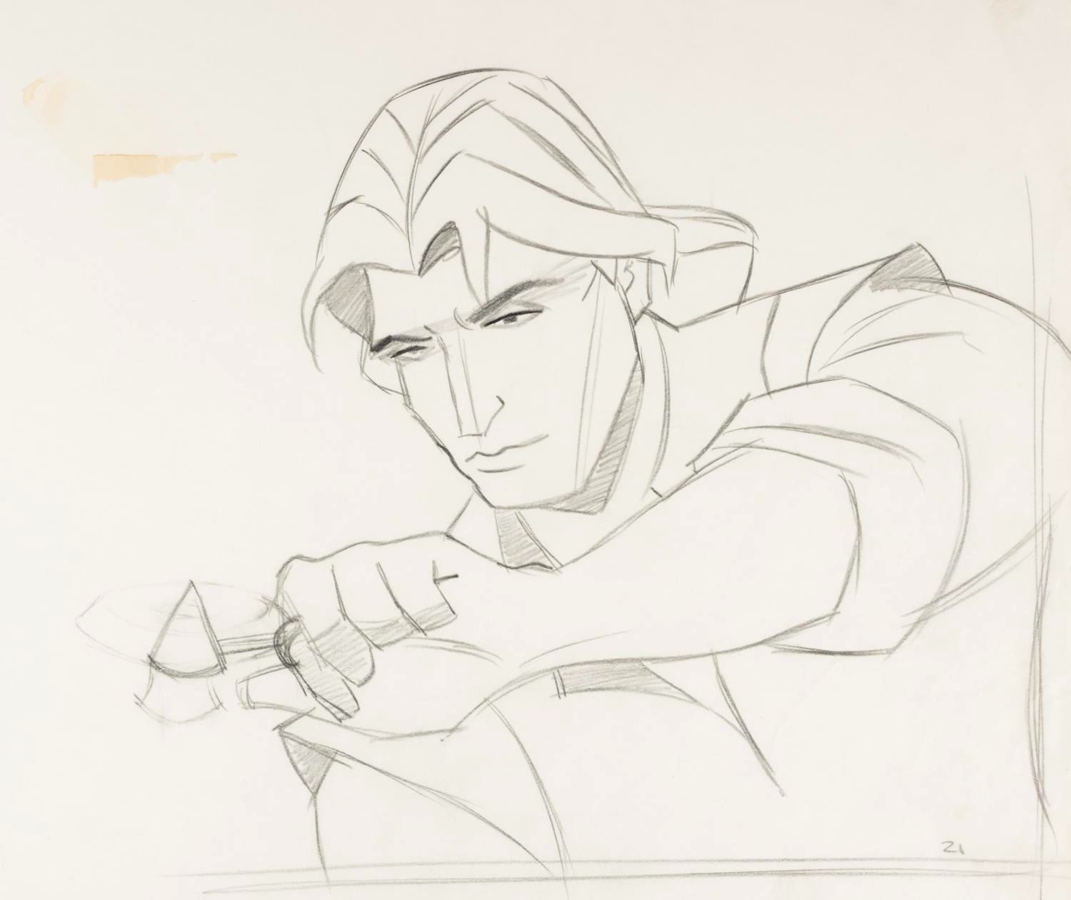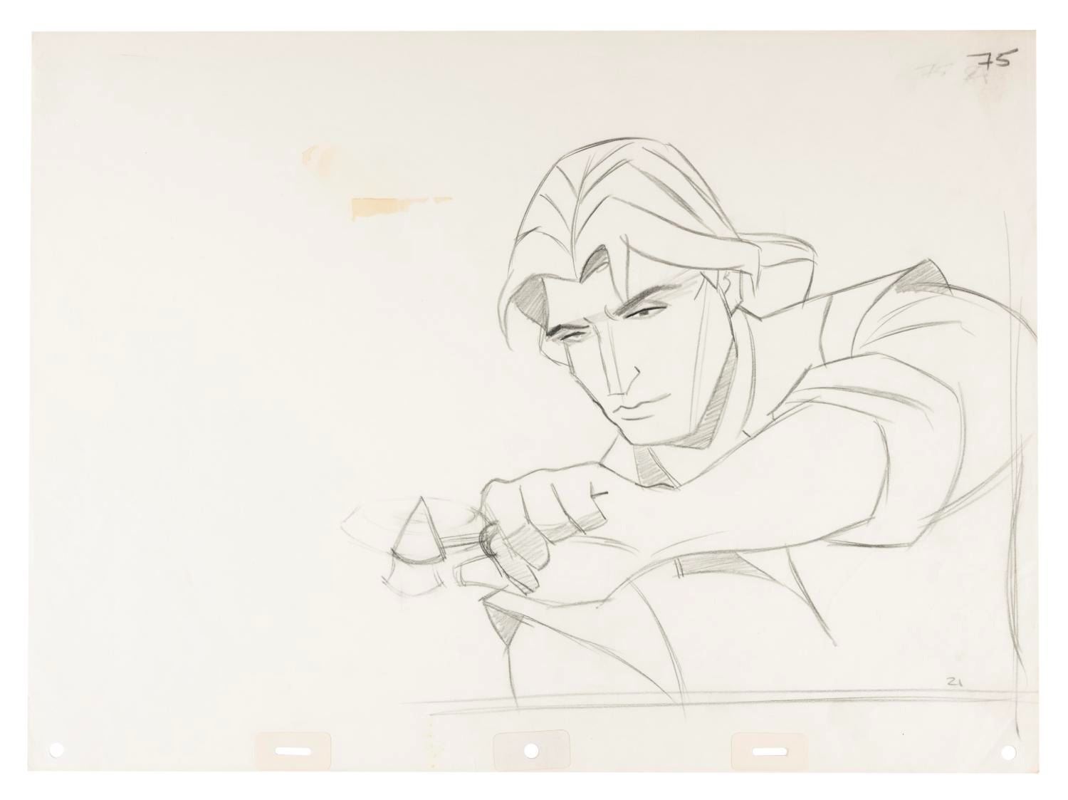 (Disney, 1995) An original pencil production drawing of John Smith from the Disney animated feature “Pocahontas.” With an image size of 9.5” x 11.5” on 12.5” x 17” animation paper, the drawing is in very good production-used condition, with a small stain and light smudging.