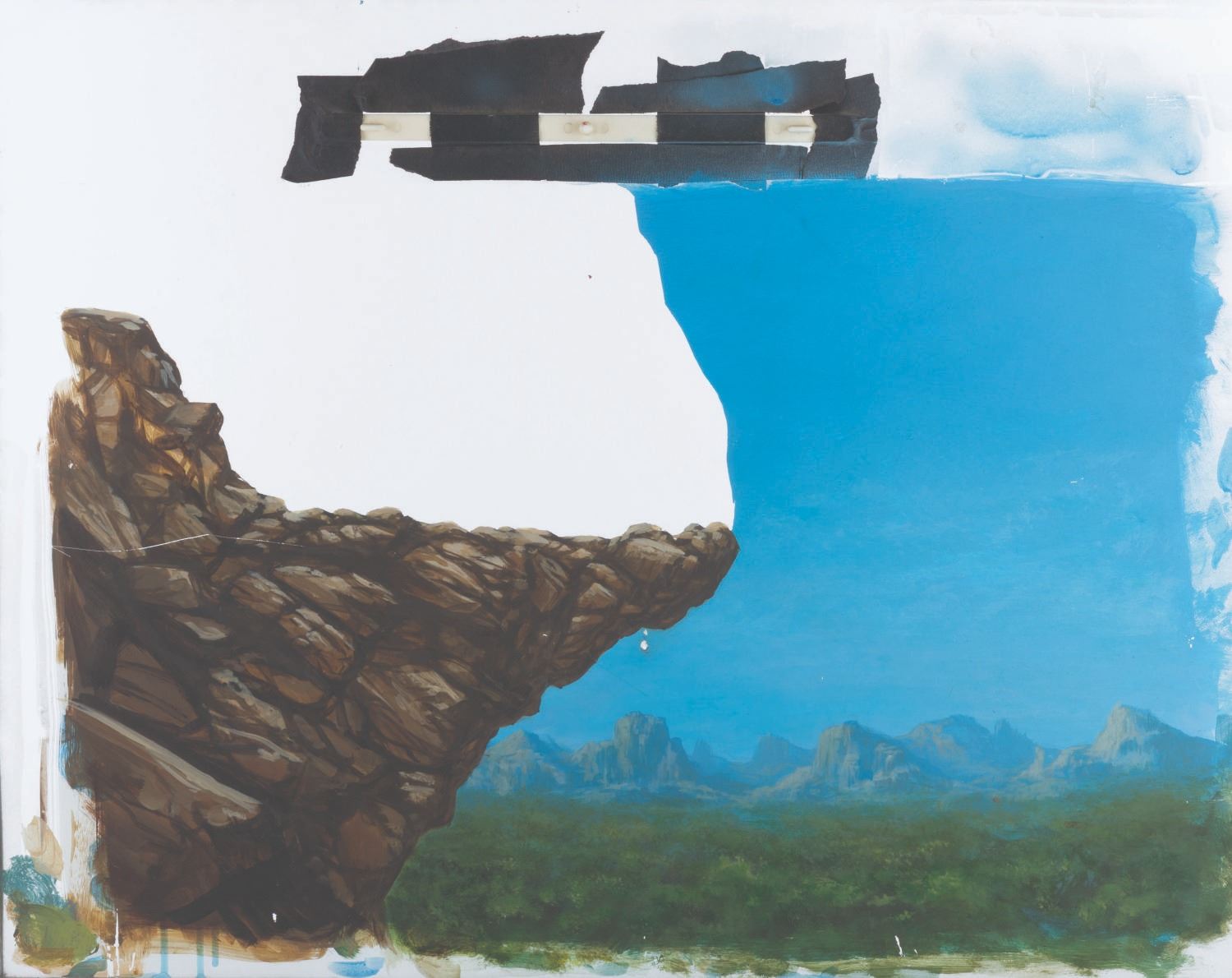 (ABC, 1991-92) An original matte painting from “Land of the Lost.” The matte paintings for the show were created by Charlie Chiodo by painting a portion of a landscape onto a pane of glass with acrylic. The painting would then be placed in front of the camera with the actors filmed several yards back through the unpainted area. The result was the illusion of the characters standing in a wide-open, prehistoric world. The image area measures 15.5” x 22.25” on the 21” x 26” metal framed glass pane. The matte painting is in good condition with typical wear from production use, light scratches and stains, a 10” animation peg bar taped 3” down from the top, and scuffs and scratches to the metal frame.