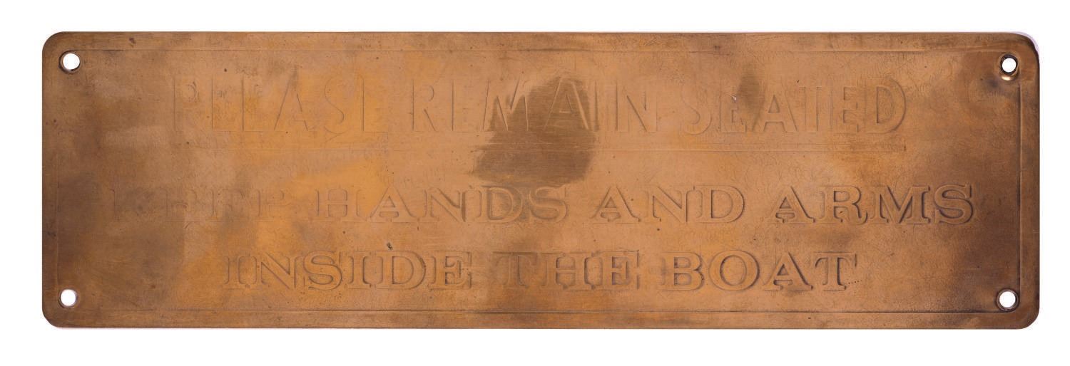 (Disneyland, 1957) An Original Motorboat Cruise Sign. This original brass sign was once mounted inside the vehicles of the Tomorrowland attraction. The piece was removed from a vehicle during a repair, scheduled rehabilitation, or upon the removal of the attraction. Measuring 10"x3", the sign is in good condition with scuffs, wear, and tarnish from exposure, handling, and age.