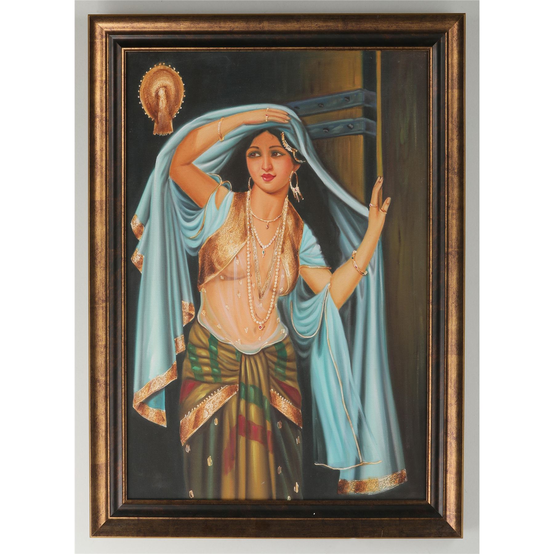 An original oil on canvas painting of an Indian belly dancer. This piece has been professionally framed. Image- 35" x 23 1/2". Frame- 40 3/4" x 29 1/4".