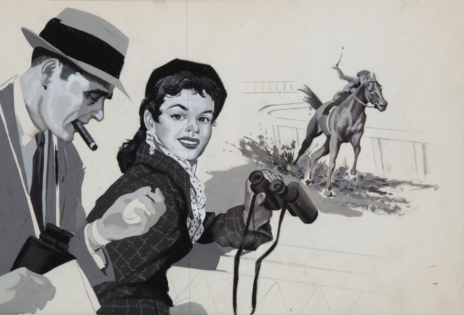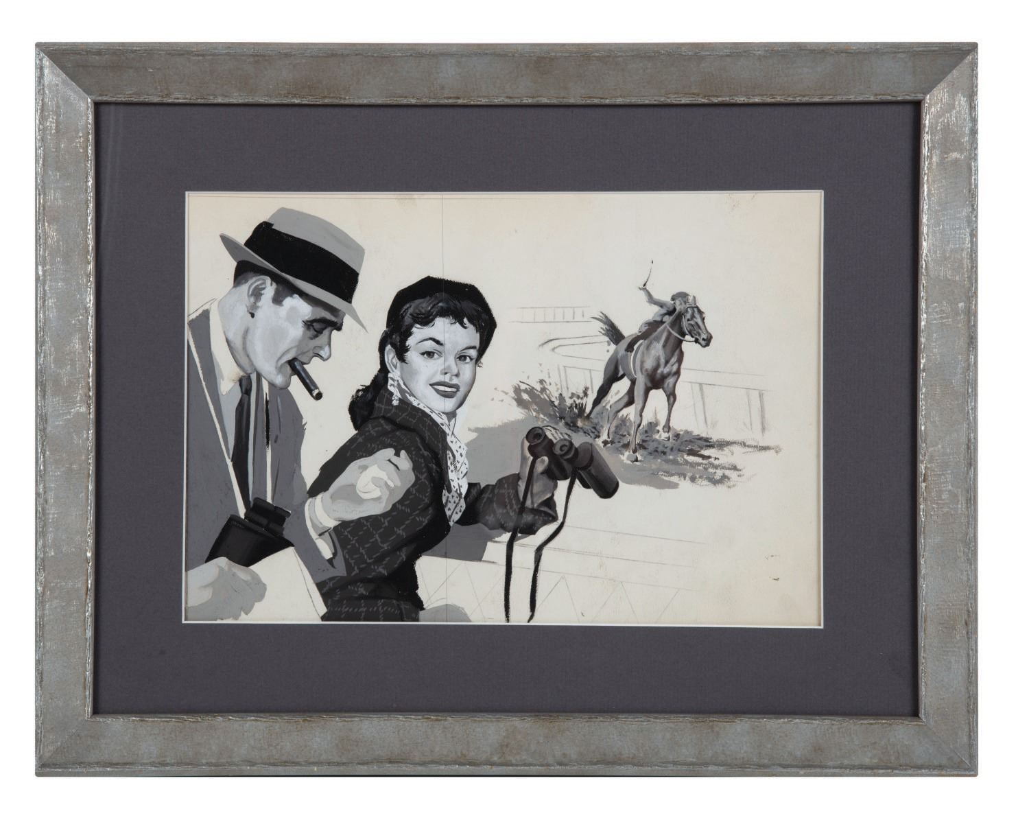(1950s-60s) An original painting created for publication of a man and woman timing a racehorse. This was most likely to illustrate a short story in a magazine, as a vertical pencil line marks where the page fold would fall. The unfinished look of portions of the image was likely a stylistic choice rather than indicating an unfinished work. With image size of 12"x9" on 15"x10.5" art board, the painting is in very good condition with small smudges.