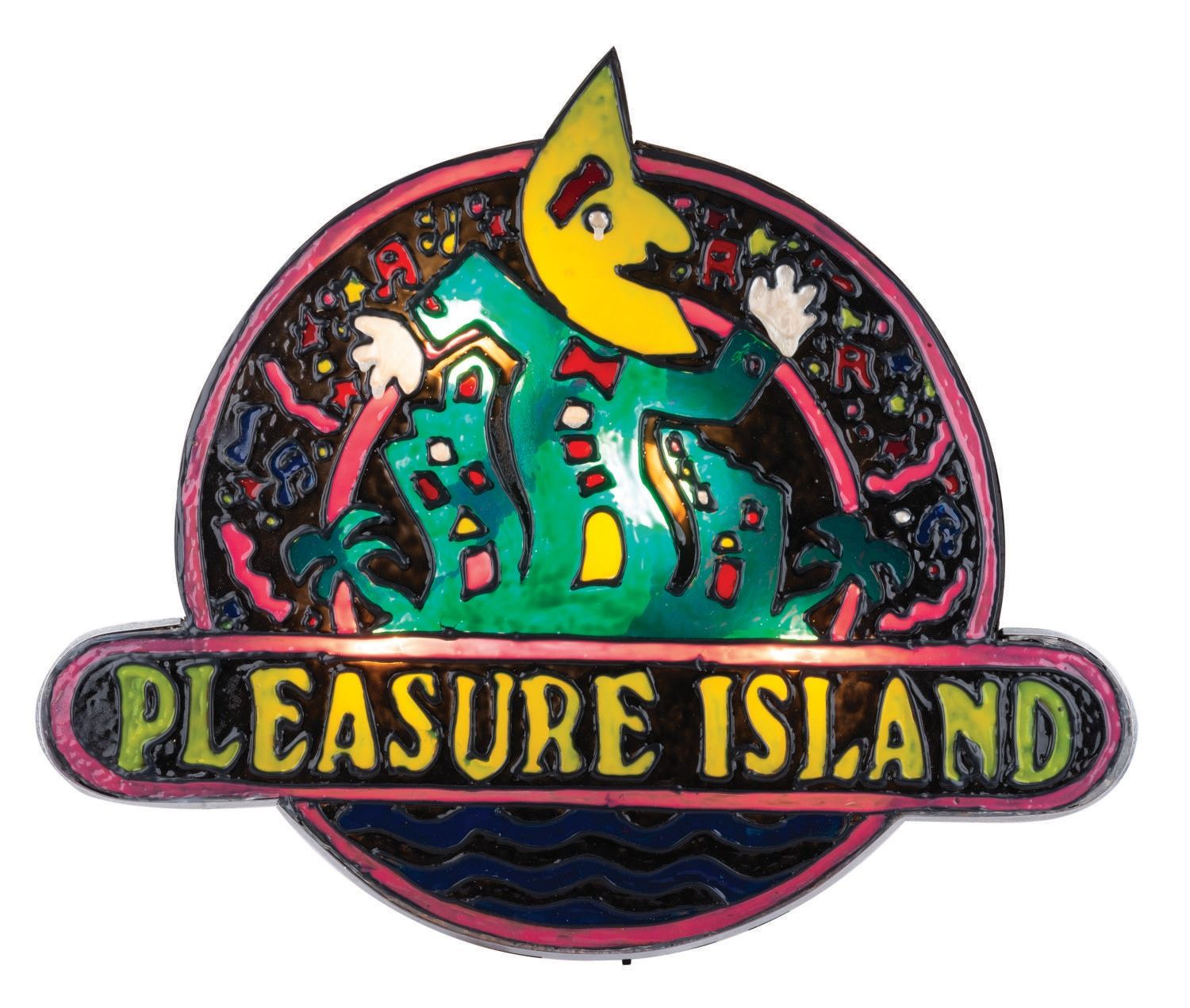 (Walt Disney World, 1989) An original illuminating sign from Pleasure Island at Walt Disney World. The sign has been rewired with a standard plug and works well when plugged in. Measuring 24" tall, 29" long, and 4" deep, the vintage sign is in very good condition with expected wear from handling and age.