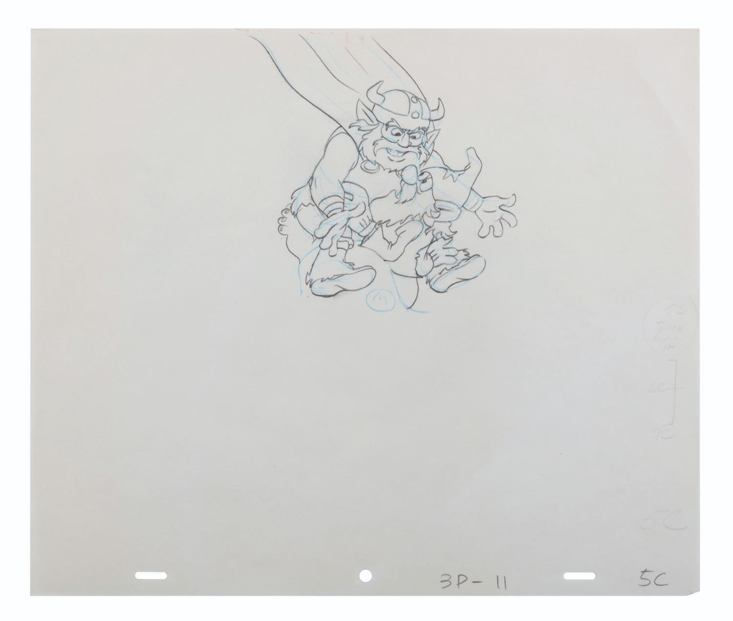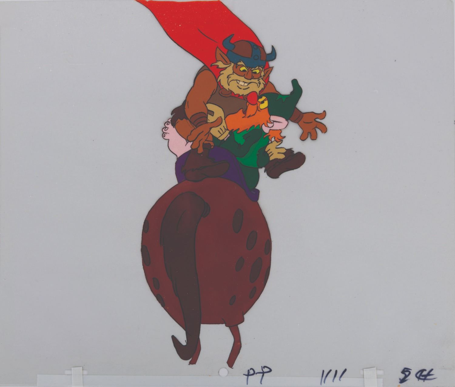 (20th Century Fox, 1977) An original production cel and drawings of the wizard Avatar and Elf General, from Ralph Bakshi's 1977 Feature Film,"Wizards." The cel and animation papers measure 10.5"x12.5". The cel has a total character image size of 9.75"x5.5". The cel is in fine condition, with some light wear to the black lines.