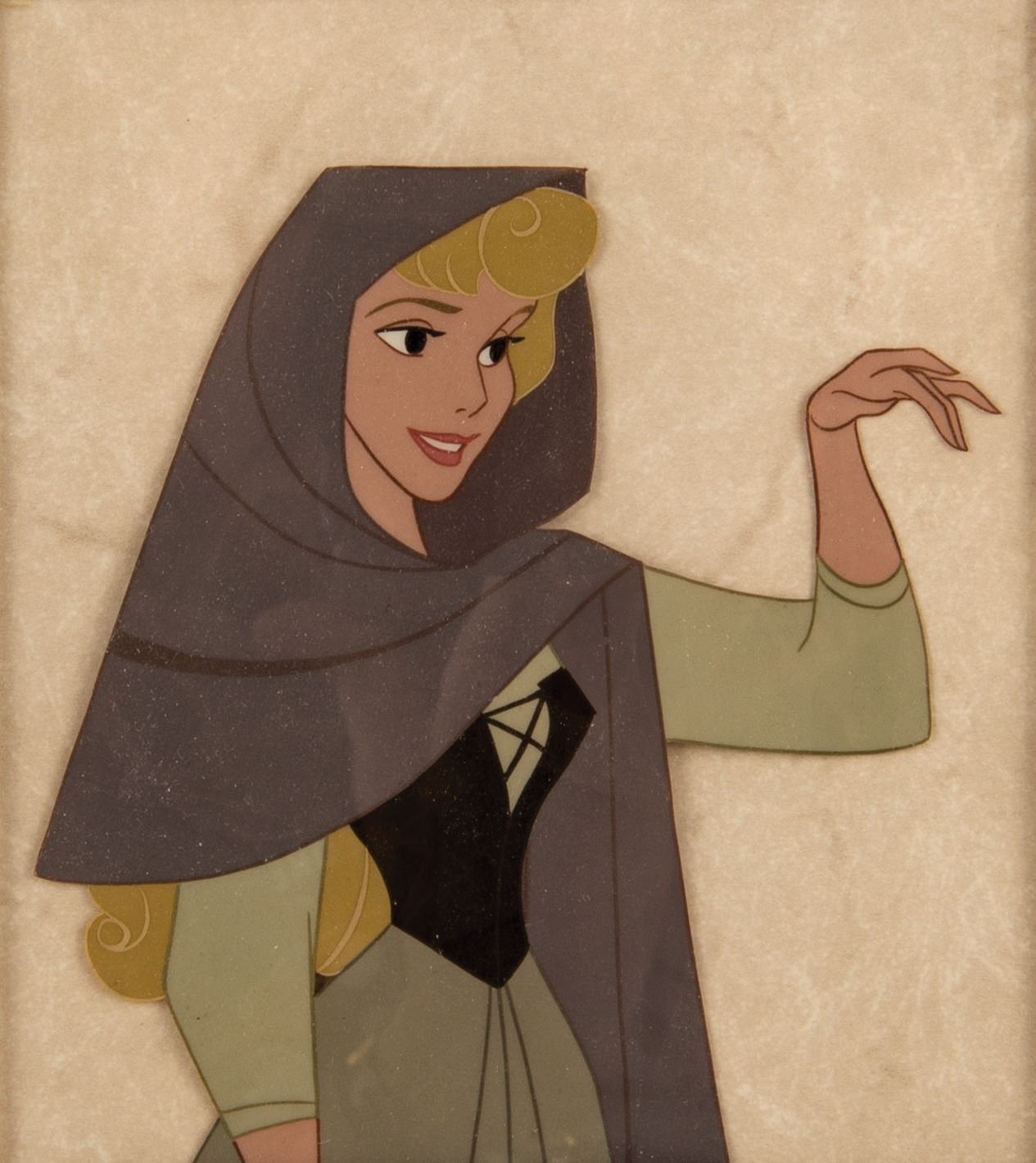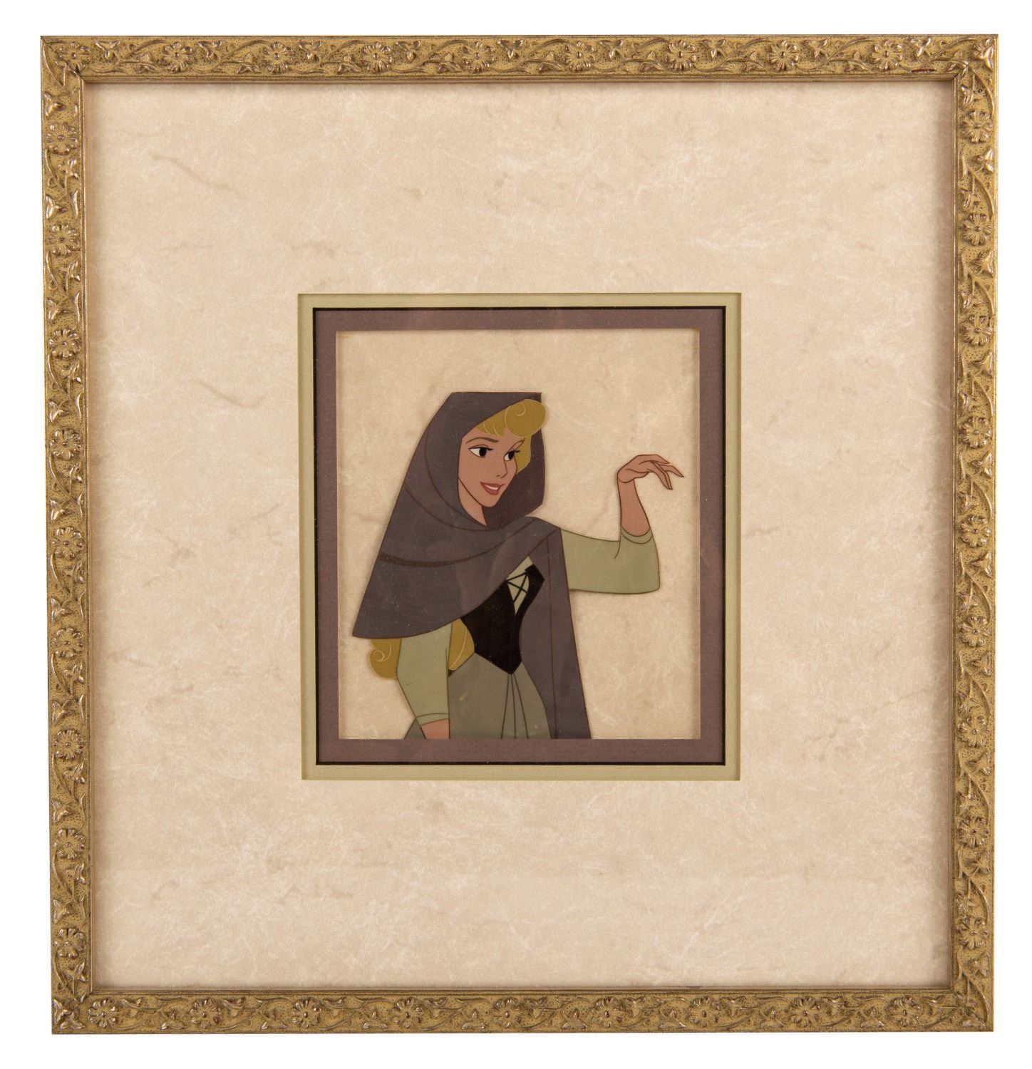(Disney, 1959) An original production cel of Briar Rose from Walt Disney's "Sleeping Beauty." Briar Rose has an image size of 4.5"x4.5" on a 5"x6.5" trimmed cel. The cel is in very good condition with all paint intact.