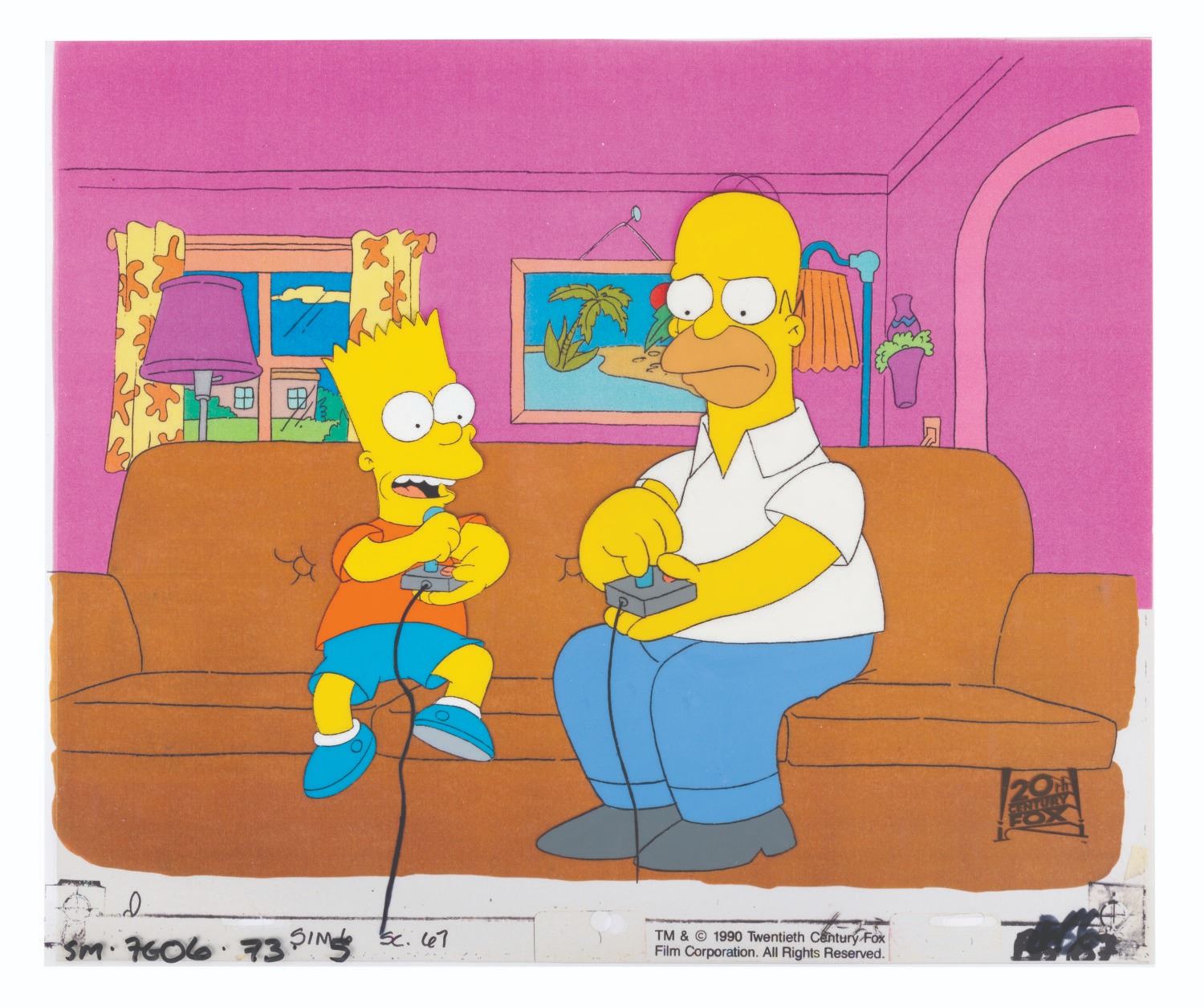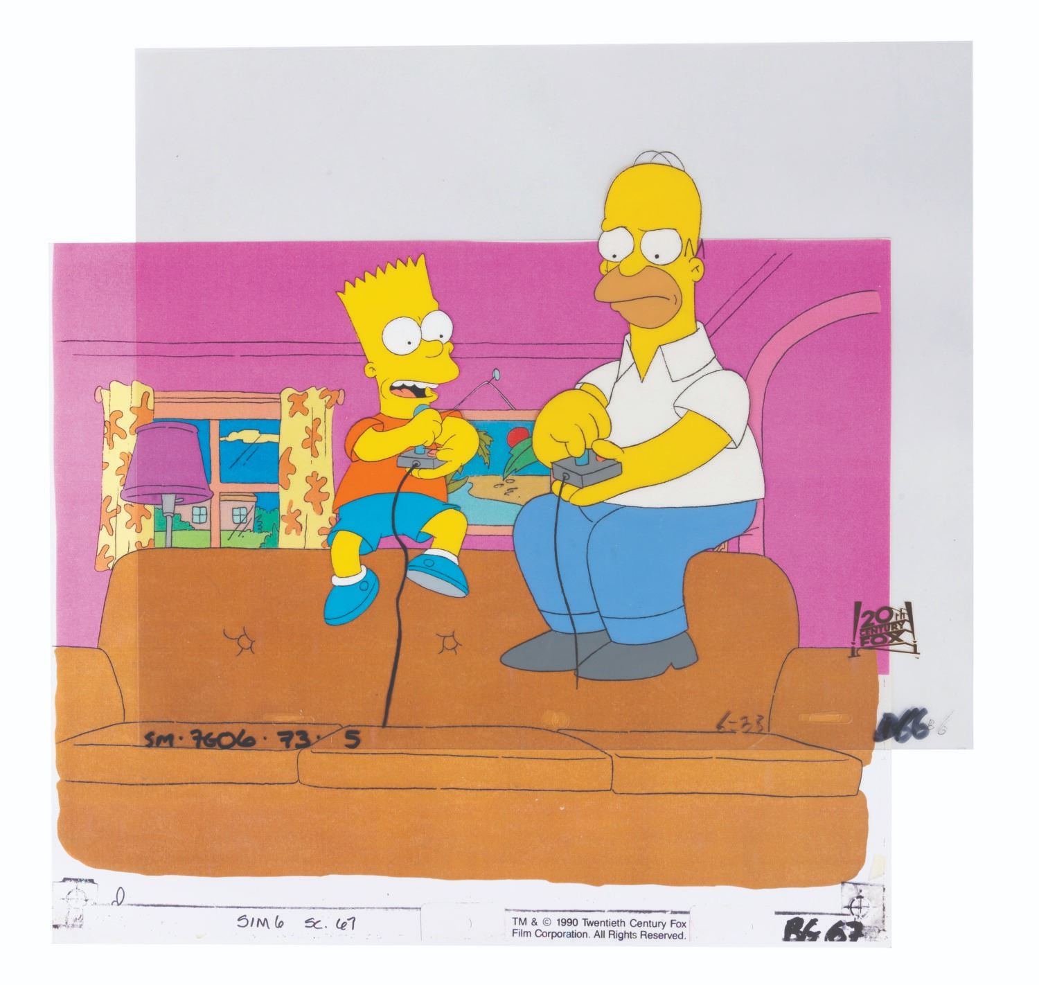 (Fox, 1990) An original production cel of Bart and Homer Simpson playing video games, from the first season of The Simpsons."Moaning Lisa" was the 6th episode of season one, airing February 11, 1990, and featuring a side story of Bart and Homer playing the video game Super Slugfest. The untrimmed cel measures 10.5"x12.5" cel with a total character image size measuring 6.5"x7.5", and has been placed on a color copy background. The cel is in very good production-used condition.