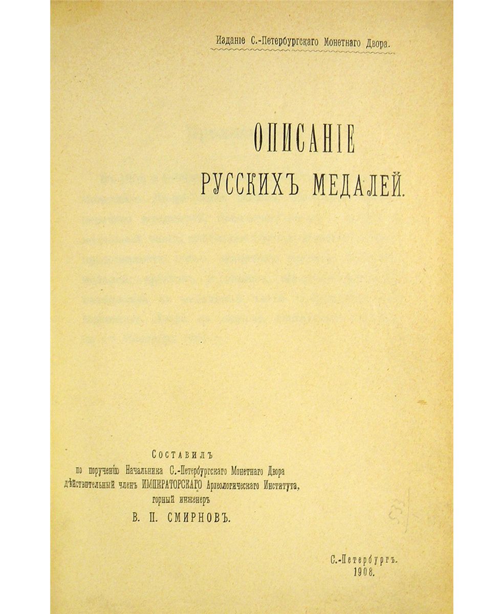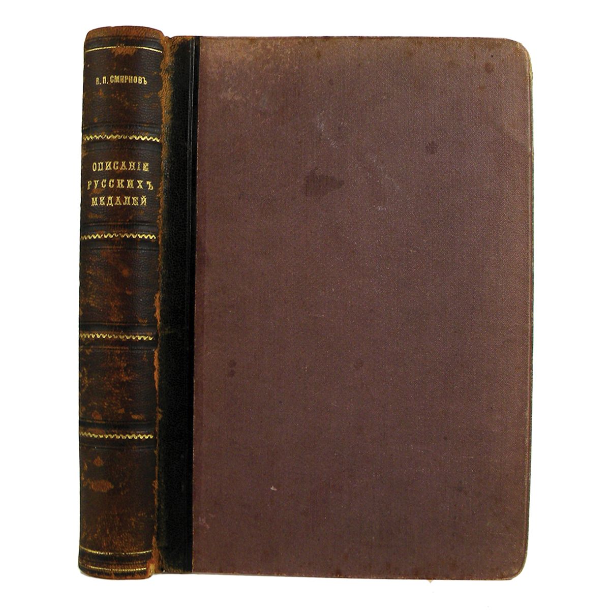 Smirnov, V.P. ОПИСАНIЕ ПУССКИХЪ МЕДАЛЕЙ. St. Petersburg, 1908. 8vo, contemporary brown quarter morocco; spine with four raised bands, ruled and lettered in gilt. (4), 748 pages; 1394 detailed descriptions. Binding rubbed, but sound; else near fine. An extensive catalogue of approximately 1400 dies of commemorative and table medals produced at the St. Petersburg Mint, along with listings of campaign medals, duty badges, etc. Extremely rare. Clain-Stefanelli 14952*. Yakovchuk 319.