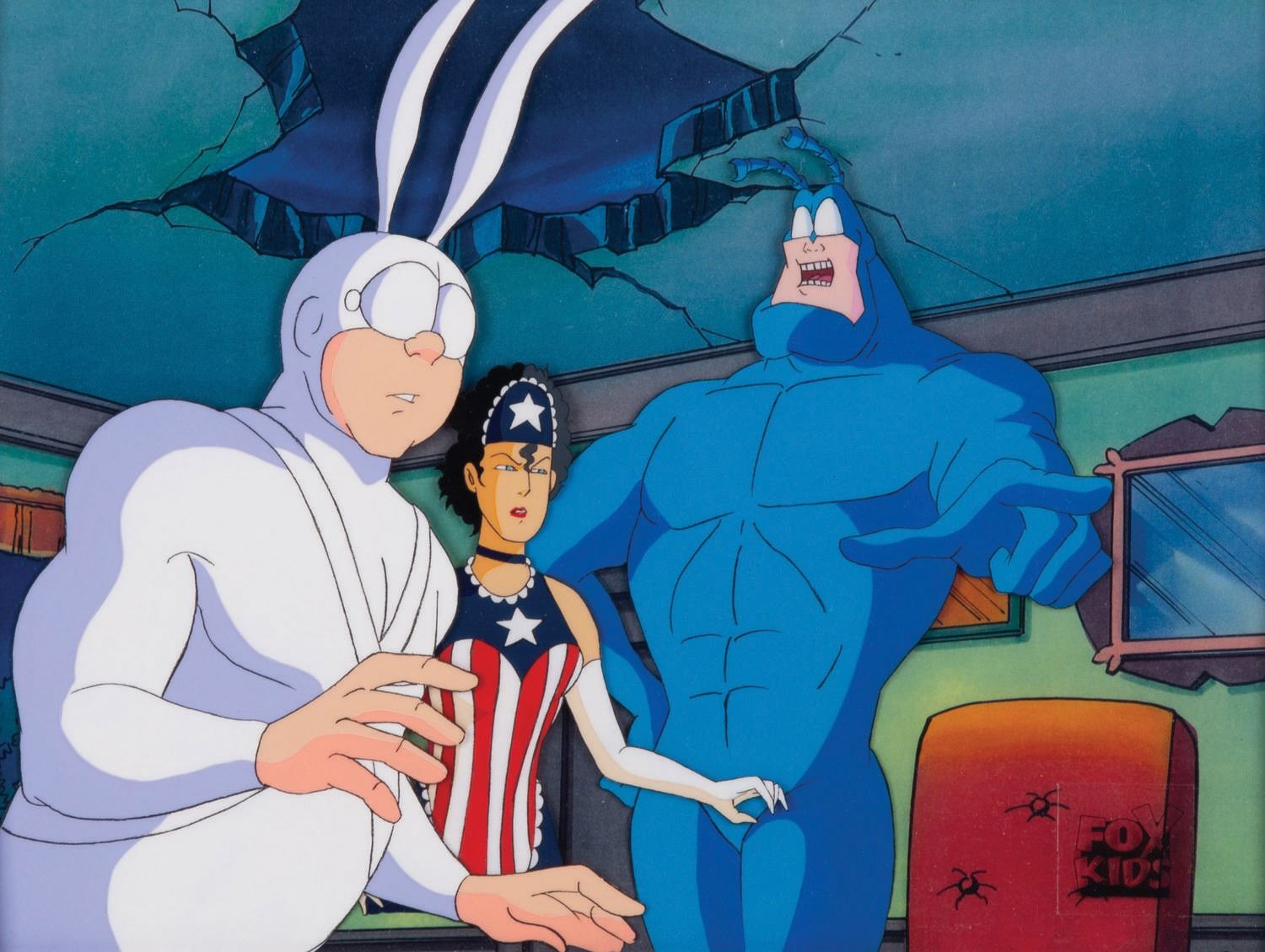 (Fox Kids, 1995) A rare original production cel of Tick, Arthur, and American Maid from Fox's popular TV Series, " The Tick." The total image size of the characters is 10.5"x9" on an untrimmed 12"x10" animation cel. The cel has been placed on a screen-matching color copy background and is in fine condition.