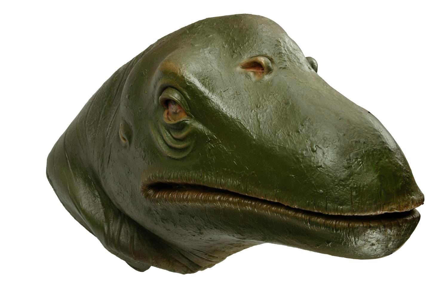 (EPCOT, 1982-96) An extremely rare original dinosaur head from Universe of Energy Pavilion at Walt Disney World. The head was featured in Universe of Energy when EPCOT opened in 1982. It was removed before the installation of Ellen's Energy Adventure in 1996 and gifted to a Walt Disney Imagineer. Constructed of pressed vinyl over a wood armature, the head measures 34"x26"x18". It comes with a pair of non-original eyes. the piece is wall-mountable and in very good condition, with wear from Park-use.