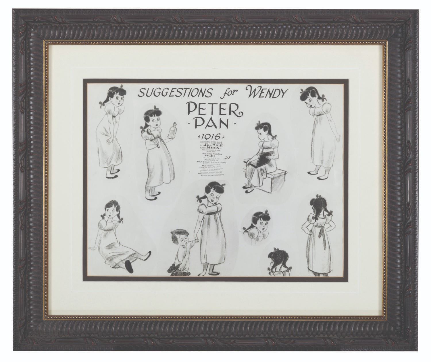 (Disney, 1953) A studio produced photostat model sheet of Wendy for the 1953 feature film, "Peter Pan." Model sheets such as these were distributed to animators and crew working on the film so that everyone could draw the character the same way. The sheet measures 11"x11" and is in good condition with some wear and wrinkling to the edges.