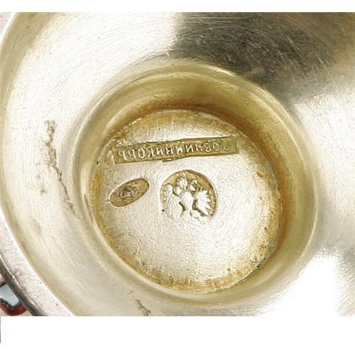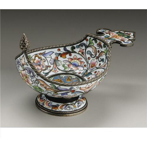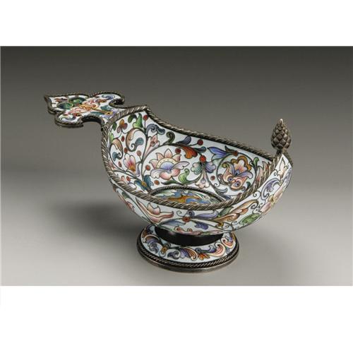 <B>A Russian Silver and Champleve Enamel Kovsh</B></I><BR><BR>Pavel Akimov Ovchinnikov, Moscow, Russia<BR>Circa 1896-08<BR>Silver, silver gilt and champleve enamel<BR>Marks: (left facing kokoshnik), <I>Ovchinnikov</B></I> (in Cyrillic) under Imperial Warrant, <I>84, PO </B></I>(in Cyrillic)<BR>4.62 in. long<BR><BR>Of small kovsh form, with floral and scroll decoration, the bottom of the bowl with lion within roundel.<BR><BR>Provenance:<BR>Walsh Family Art Trust