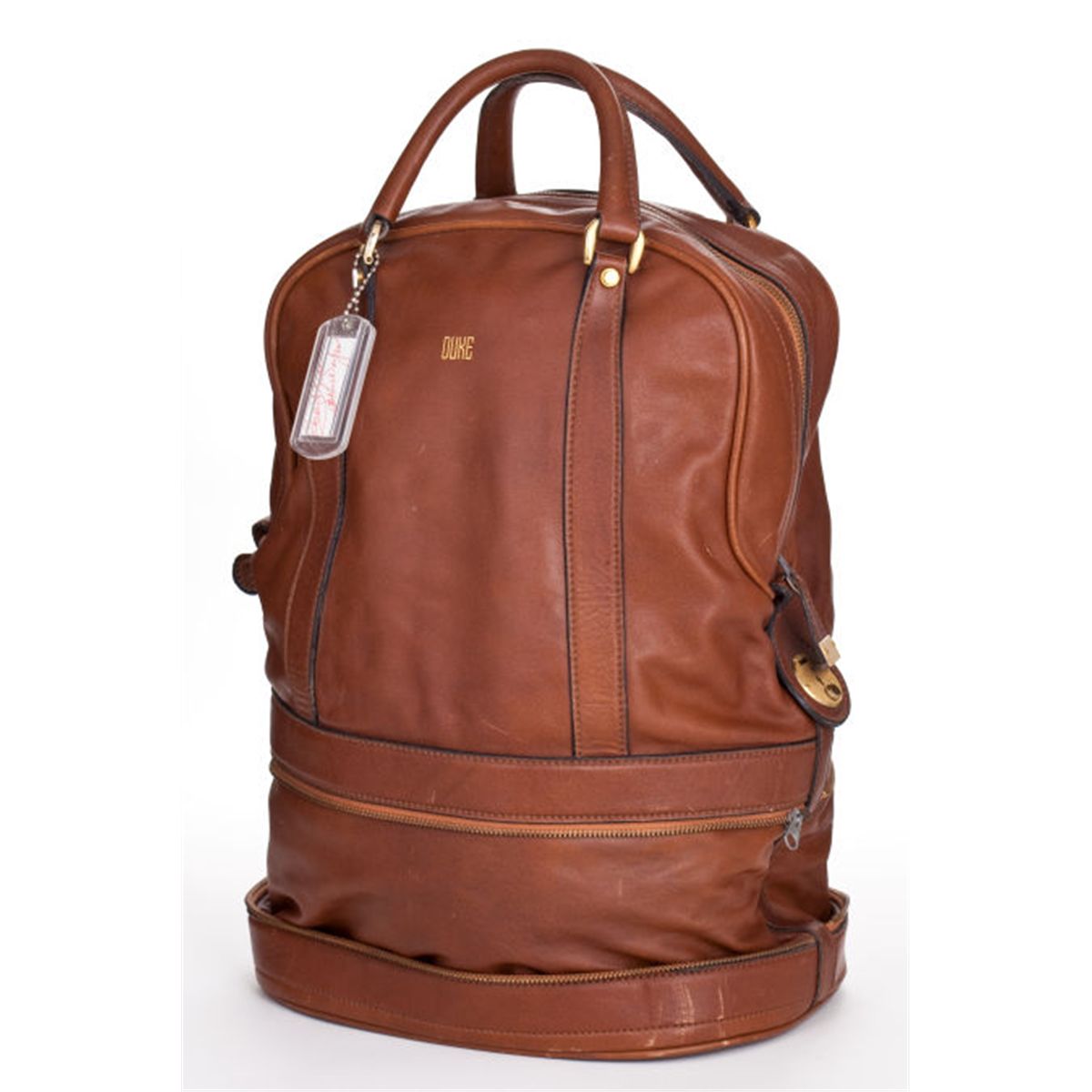 An Overnight Bag, 1950s. Made of brown leather in an oblong shape, with a zip bottom for expansion, maker's stamp on top reads "Mark Cross / Italy," embossed in gold on front "Duke," with a plastic tag affixed to handle with one of Wayne's autograph cards inside.19" x 13" x 6"