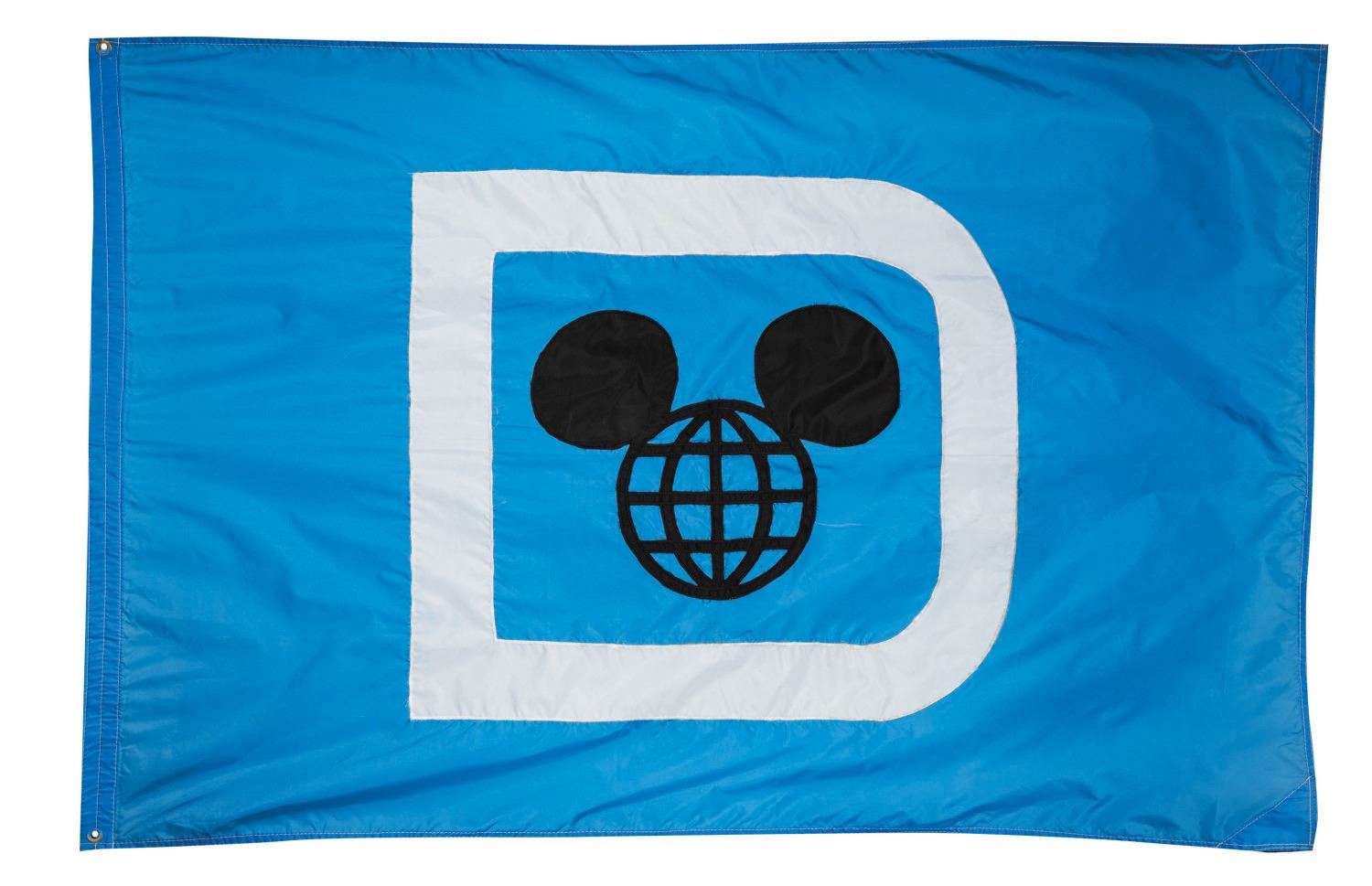 (Walt Disney World, 1990s) A large "Mickey World" Flag flown at Walt Disney World. The double-sided flag features the "Mickey World" logo inside the Disney World "D." Measuring 70"x47", the flag is in very good condition, exhibiting some wear to threads and material from Park use.