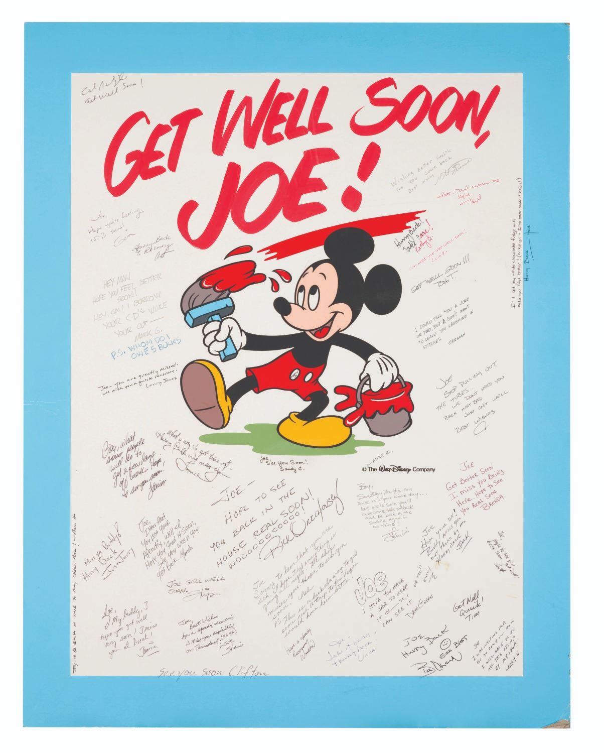 (Walt Disney Company, 1990s) An oversized "Get Well Soon" card given to an employee of The Walt Disney Company. The card depicts Mickey Mouse painting, surrounded by signatures addressed to an employee named Joe. Measuring 21.75"x28.25", the pieces are in overall very good condition, despite minor scuffs and wear to surfaces, some edges and corners.