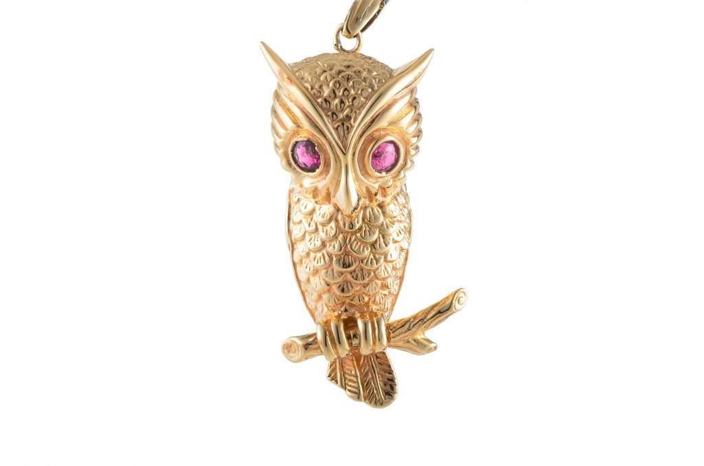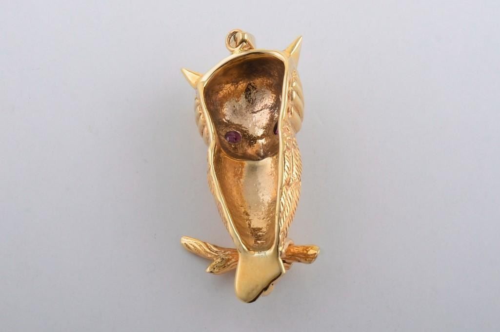 Pendant of an owl on a branch set with ruby eyes totaling 0.3 carats. Height approximately 1 1/2 inches excluding bail. 14K gold. Weight 13.1g.