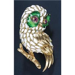 An 'Owl' brooch, modeled standing on a branch with engraved wings and tail, white enamel feathers with green enamel detail and ruby eyes, stamped '750', 59mm high