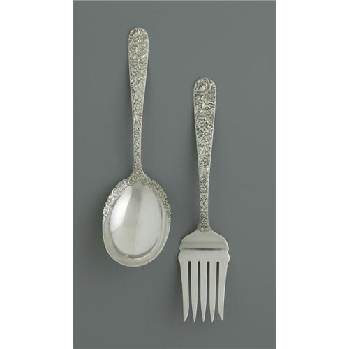 <B>An American Silver Salad Set</B></I><BR>S. Kirk & Son Co., Baltimore, MD, Early Twentieth Century<BR><BR>The 'Repousse' pattern salad fork and spoon, marked on the reverse<BR>9.3in. long