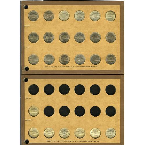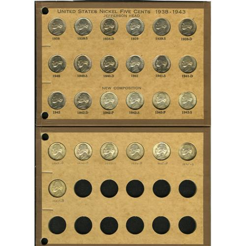 <B>An Uncertified Partial Set of Jefferson Nickels.</B></I> All dates and mintmarks between 1938 and 1945 are included. Both the 1942 and 1942-P are present. Housed in an old Wayte Raymond two page holder. Grades range between MS64 and MS66.