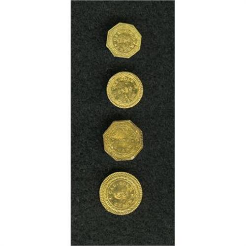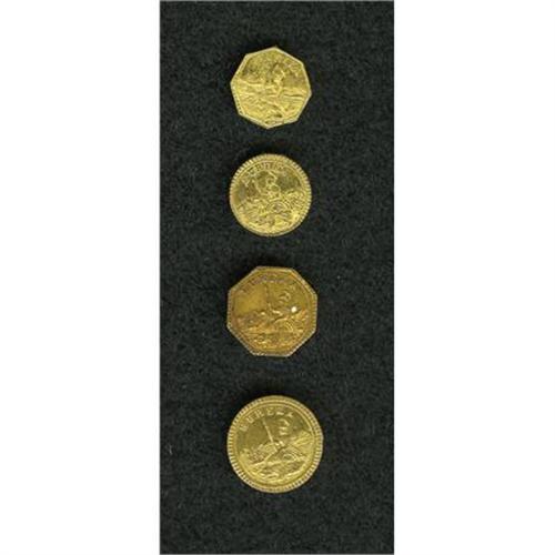 <B>An Uncertified Quartet of California Gold Charms.</B></I> All four pieces are dated 1884 and feature Minerva with bear and ship, EUREKA above. Two are octagonal, and two are round. A lustrous green-gold foursome.<BR><BR><b>Shipping:</b> Coin/Currency (<a target="_blank" href="http://www.heritageauctions.com/common/shipping.php">view shipping information</a>)