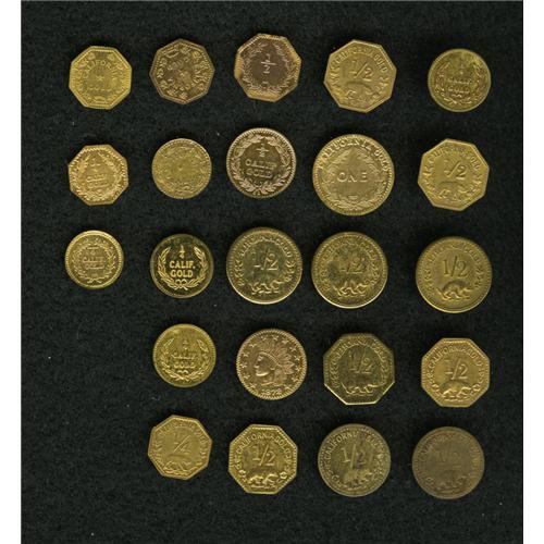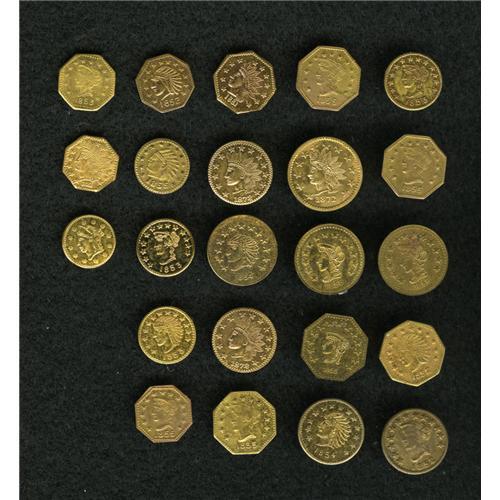 <B>An Uncertified group of (23) California Gold Charms.</B></I> The pieces appear lustrous, and the lot includes round and octagonal pieces with a variety of Indian and Liberty types.<BR><BR><b>Shipping:</b> Coins & Currency (<a target="_blank" href="http://www.heritageauctions.com/common/shipping.php">view shipping information</a>)