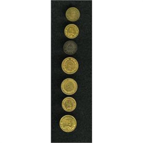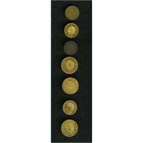 <B>An Uncertified lot of (7) California Gold Charms.</B></I> The lot contains: 1852 Round 1/2, Indian/Bear, MS60; 1853 Round, Indian/Wreath, AU58, double struck reverse; 1855 Round 1/4, Indian/Bear, MS63; 1855 Round, Indian/Wreath, MS60; 1859 Round, Indian/Wreath, XF; 1859 Round 1/4, Indian/Bear, MS60; and an 1861 Round, Liberty Head/Wreath, AU58.<BR><BR><b>Shipping:</b> Coin/Currency (<a target="_blank" href="http://www.heritageauctions.com/common/shipping.php">view shipping information</a>)