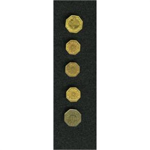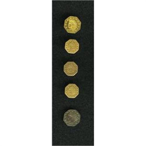 <B>An Uncertified lot of California Gold Charms.</B></I> These pieces appear problem-free and Mint State. All feature an Indian head left with stars. The reverse has legends and/or a wreath. The dates include: 1853, 1854, 1856, 1858, and 1880.<BR><BR><b>Shipping:</b> Coin/Currency (<a target="_blank" href="http://www.heritageauctions.com/common/shipping.php">view shipping information</a>)