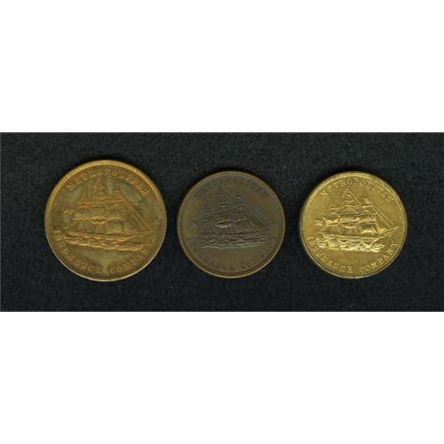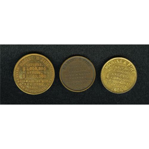 <B>An Uncertified Lot of Mid-19th Century Tokens.</B></I> Three tokens from the Metropolitan Insurance Co., NY-NY 205, NY-NY 206, and NY-NY 210, ranging from XF to Uncirculated. Listed in the Rulau token reference, fourth edition. Viewing is suggested.