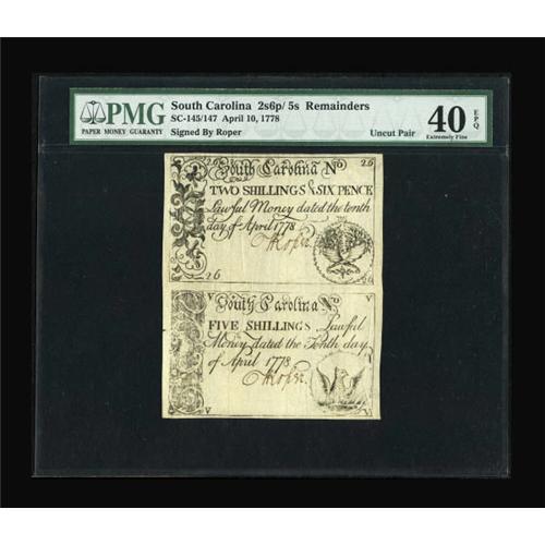 <B>An Uncut Pair South Carolina April 10, 1778 2s/6d and 5s PMG Extremely Fine 40 EPQ.</B></I> Faint, as-made crinkles are noted in the paper but do not detract from the overall appeal of this lightly handled remainder. This pair is a perfect match to the two note remainder also offered in this auction. On the original sheets, this pair would have resided directly to the left of the denominations offered in that lot.<BR><BR><b>Shipping:</b> Coins & Currency (<a target="_blank" href="http://www.heritageauctions.com/common/shipping.php">view shipping information</a>)