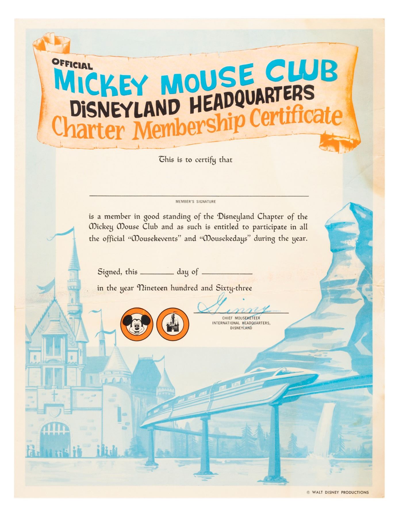 (Disneyland, 1963) An unused Charter Member Certificate from the Disneyland Mickey Mouse Club Headquarters. When the Mickey Mouse Club went into syndication on television in 1963, the Club headquarters opened as an attraction in the Main Street Opera House at Disneyland. Children could sign up as members, purchase souvenirs, and meet Mickey Mouse. The certificate features a facsimile signature by Ginny (Tyler) who hosted new live segments, that aired with the reruns on Los Angeles station KTLA-TV. Measuring 8.5” x 11”, the piece is in good condition, with slight wear to edges, a horizontal fold, and very slight discoloration from age.