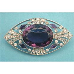 An amethyst and diamond set navette shaped openwork brooch, the central large faceted oval amethyst bordered by 4 further lozenge shaped amethysts and round and rose cut diamonds (see illustration) £1000-1200