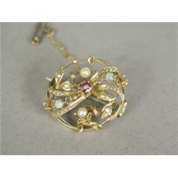 An antique 14ct gold brooch set with a ruby, two opals and seed pearls, 2.5cm long, with a safety chain Est. 75/100