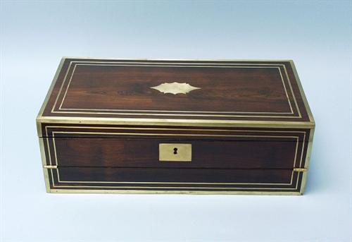 An antique English mahogany traveling desk with brass and ivory inlay. Brass mounts. Interior fitted with a velvet lined writing surface and several small compartments. 20" x 10 1/2".