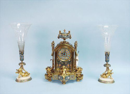 An antique French 3 piece champleve, crystal and gilt bronze clock set. The champleve faced clock with Roman numerals, decorated with a sitting putto and several animal heads, surmounted with a champleve urn. 16 1/2" high. Accompanied by a pair of etched crystal vases, each in form of a "horn-of-plenty", supported by a bronze putto on a champleve framed onyx base. Each 18 1/4" high.