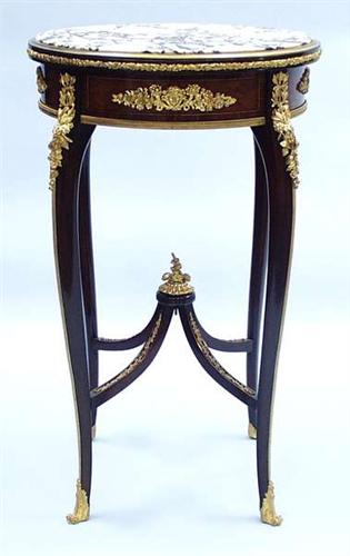 An antique French Louis XV style parquetry inlaid circular table. The veined marble top with bronze mounted apron and one drawer, raised on long cabriole legs with gilt bronze floral chutes and scroll sabots. Top 18" dia., 30" high. 6000-7000