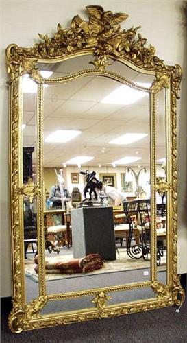 An antique French Louis XV style rectangular grand salon wall mirror in extensively carved gilt wood double frame. Top ornament carved with a pair of birds and arrows amongst flora. 68" high, 42" wide. 7000-8000