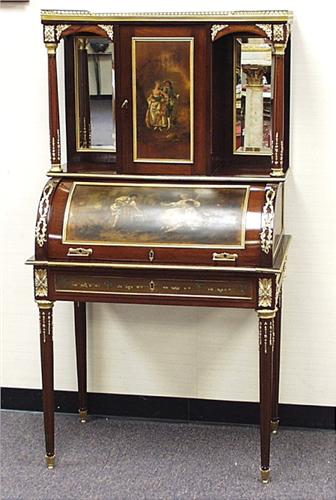 An antique French Louis XVI style Vernis Martin decorated secretary cabinet. Top with a central cupboard, roll top secretary hand painted and lacquered in "Vernis Martin" style with figural scenes. Frieze drawer decorated with extensive gilt bronze mountings. Fluted legs mounted with gilt bronze chutes and thimble sabots. Rare woods of very fine quality. 32" wide, 20" deep, 59 1/2" high.