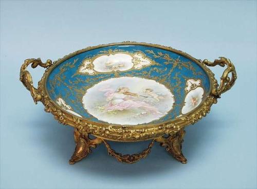 An antique French Sevres porcelain centrepiece with gilt bronze mounts. Central medallion hand painted with a young beauty playing the violin and surrounded by a green border with gilt scrollwork. Fine quality. 3500-4000