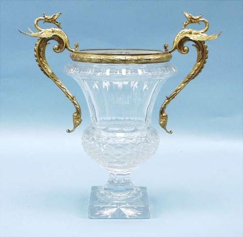 An antique French cut crystal vase with ormolu mountings and twin dragon ormolu handles. Circa 1880. Approx. 10" high. 2000-3000