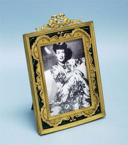 An antique French gilt bronze and enamel easel picture frame. Rectangular shape decorated with bronze relief scrolls and green enamel inlays. Mounted with a laurel crown. Stamped with retailer's mark on reverse. 7 1/2" x 6". 3000-3500