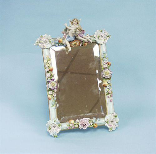 An antique German porcelain framed table mirror. Hand painted with two putti and floral decorations. Approx. 12" x 8". Nymphenburg, circa 1860.
