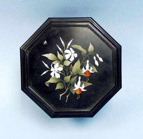 An antique Italian pietra dura inlaid ebonized box. Of octagonal form, top and sides with an intricate inlay of wild flowers, executed in the multitude of semi precious stones. Circa 1880. 9" diameter, 5 1/2"high.