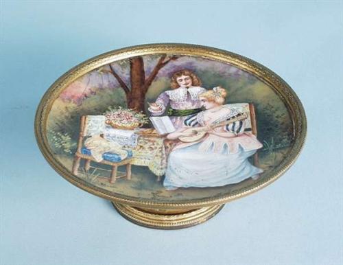 An antique Viennese porcelain pin tray. Circular form, hand painted with a garden scene. Gilt rim. 19th century. 800-1000