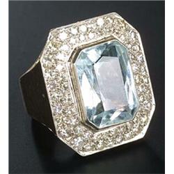 An aquamarine and diamond cluster ring, centred with a cut-corner rectangular scissors-cut aquama...