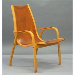 beech, teak and leather, Yngve Ekström, "Båge", 1950's, beech frame, teak arm-rests, patinated leather seat