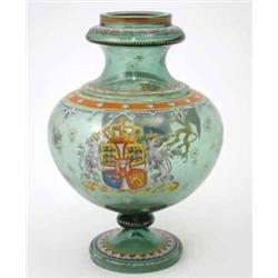 An armorial bottle green glass vase, enamelled with crest, set pattern borders and mock date, 166...
