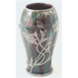 An art pottery vase, attributed to Ruskin, inlaid with engraved silver foliage against the mottle...