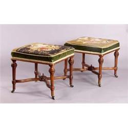 An attractive Pair of Edwardian Walnut Dressing Stools], each with square seat upholstered in Berlin woolwork with velvet walls, on slender fluted guilloche carved turned and tapering legs tied by wavy H stretcher centred by rosette finial, on brass castors {43cm} {See illustration} £600-800